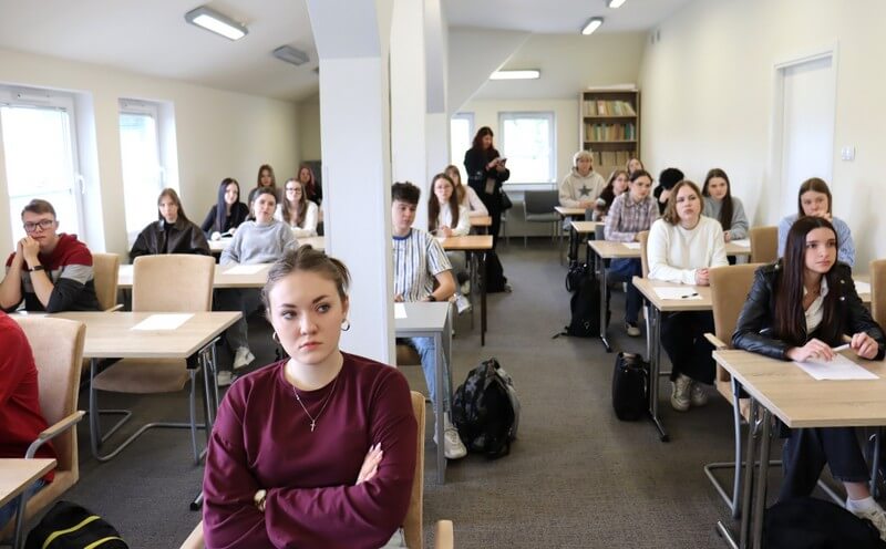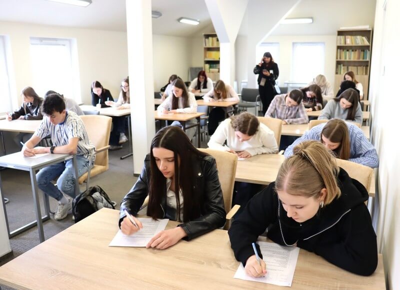 Uczestnicy konkursu siedzący przy stolikach podczas pisania testu konkursowego.