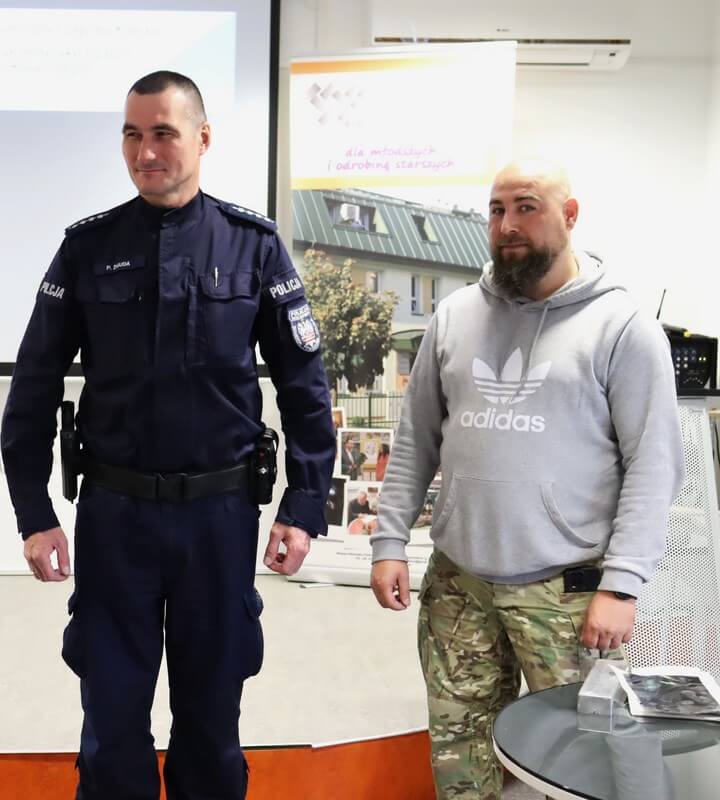 Dwie osoby stojące – funkcjonariusze policji podczas prezentacji.