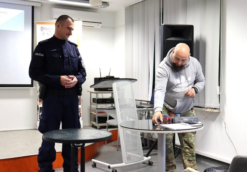 Dwie osoby stojące – funkcjonariusze policji podczas prezentacji