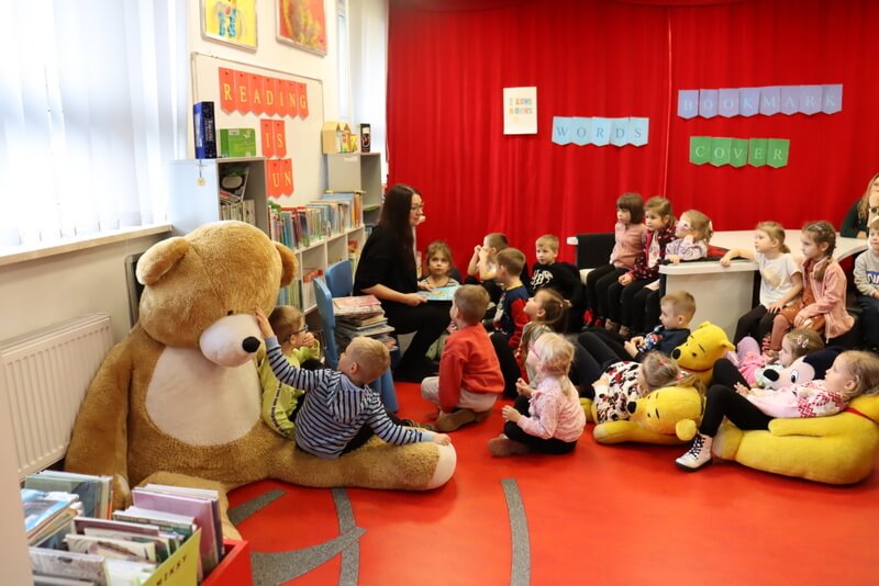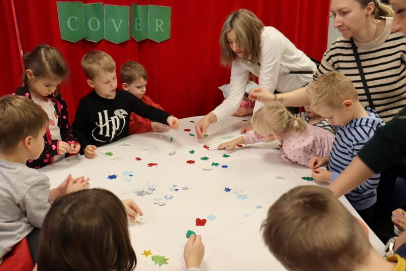 Wesołe Biedronki najpierw z entuzjazmem zwiedziły wystawę „Con Amore. Akwarele Katarzyny Melcher feat. Kreatywne Mamy DKK”, którą prezentujemy w Galerii Na Piętrze w naszej bibliotece. Dzieci miały okazję zadać pytania autorce prac, pani Kasi, która chętnie dzieliła się refleksją po wernisażu. Następnie w Oddziale dla Dzieci moi goście wysłuchali świątecznej opowieści w języku angielskim „Belive in your Elf!”. Książeczka skłoniła milusińskich do opowieści o prezentach, Świętym Mikołaju i reniferach.
