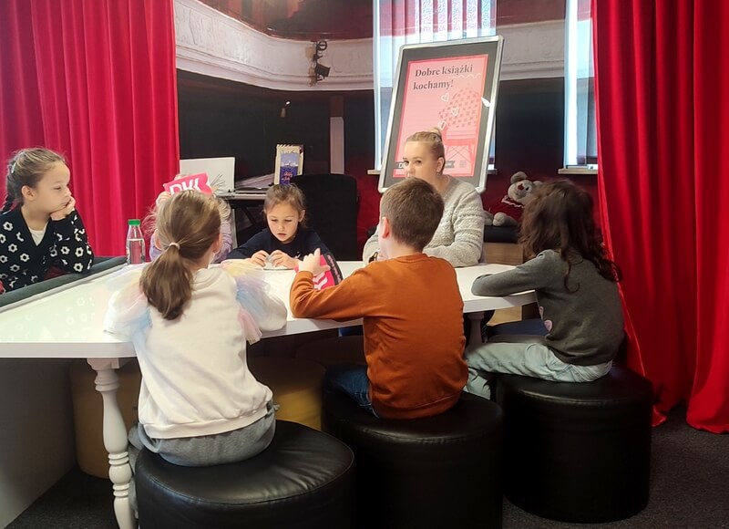 Grupa dzieci wraz z bibliotekarką siedzą wokół stołu. W oddali widnieje wyeksponowany plakat DKK. Tło stanowi wystrój w odcieniach czerwono- czarnych.