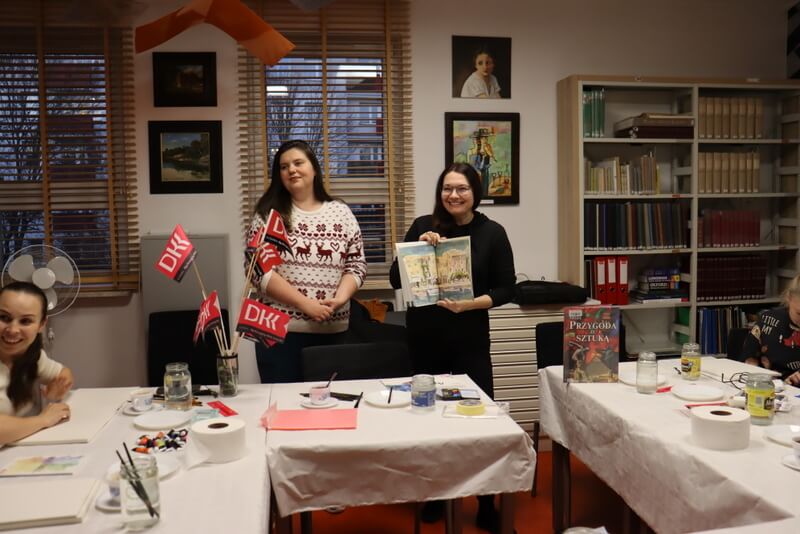 Czytelnia Działu Regionalnego. Prowadząca warsztaty (jasny sweter) i moderator Dyskusyjnego Klubu Książki (czarna bluza) otwierają zajęcia. Moderator trzyma w dłoniach książkę pokazuje młodym kobietom siedzącym przy stole. Stół nakryty białym, papierowym obrusem. Na stole przed każdą uczestniczką stoi słoik z wodą, pędzle, kolorowe farby i papier do malowania. W tle widoczne różowe chorągiewki z logo Dyskusyjnego Klubu Książki DKK, regały z książkami.