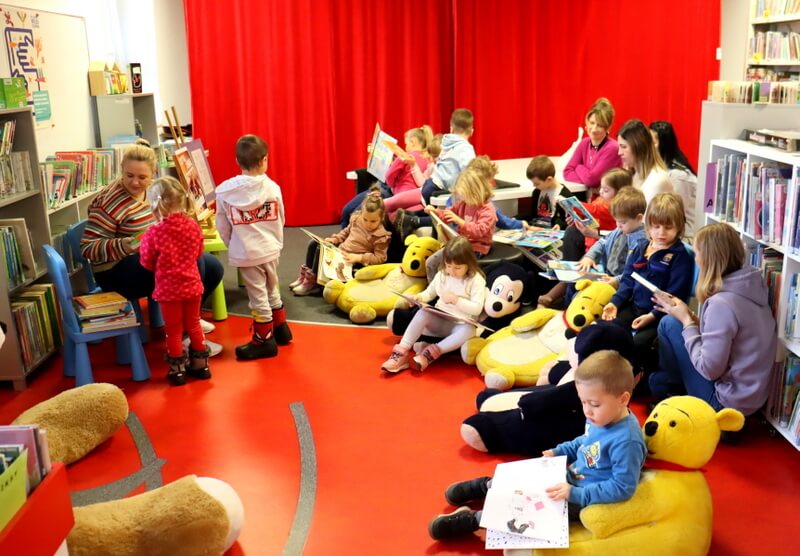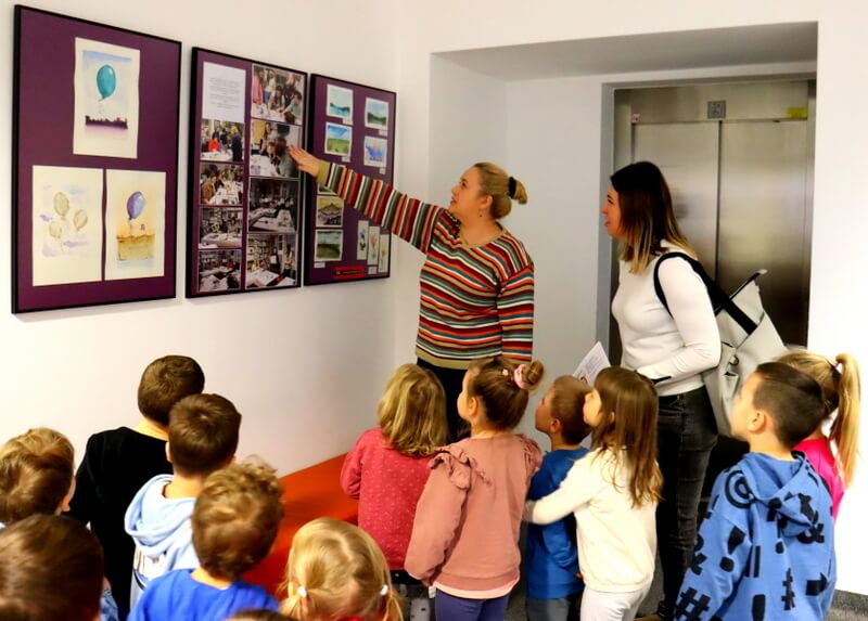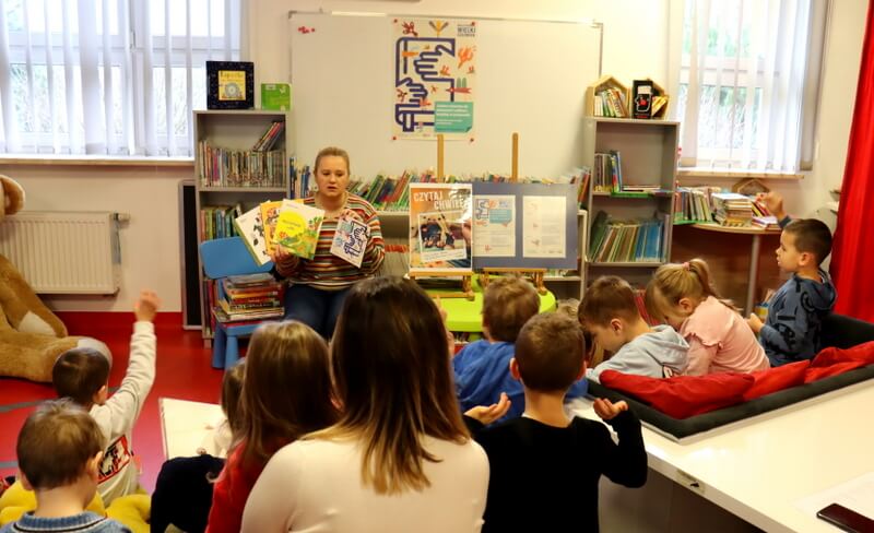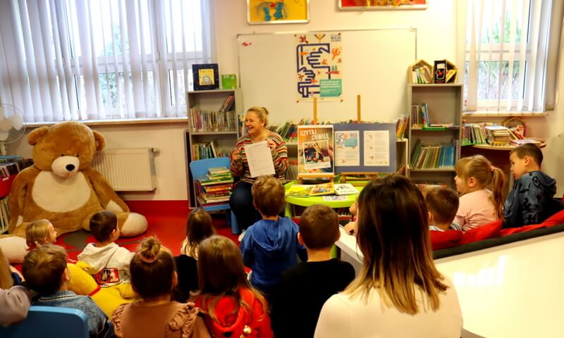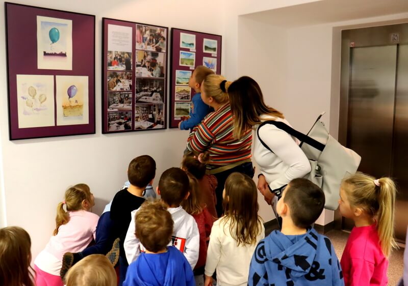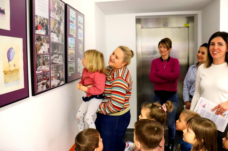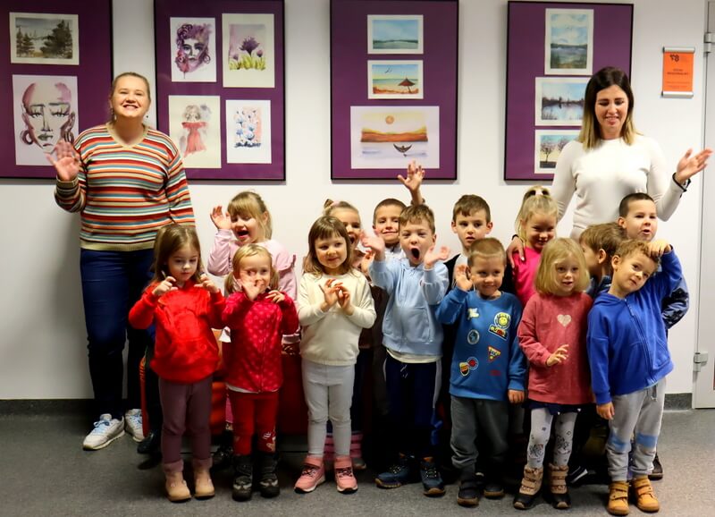Podczas oglądania galerii przedszkolaki z dużym entuzjazmem rozpoznawały swoje mamy na fotografiach dokumentujących proces twórczy. Kolejnym punktem wizyty był Oddział dla Dzieci. Tam grupa dowiedziała się, w jaki sposób można zapisać się do biblioteki i korzystać z bogatego księgozbioru dedykowanego najmłodszym. Następnie zaprezentowałam dzieciom wyjątkowy projekt czytelniczy: „Mała Książka – Wielki Człowiek”. Omówiłam zasady udziału oraz pokazałam książkowe wyprawki, które mali uczestnicy otrzymują w prezencie na start. W ostatniej części spotkania, mali goście mieli okazję do swobodnego przeglądania propozycji książkowych idealnie dopasowanych do ich wieku. Był to czas na dotykanie, oglądanie i wybieranie potencjalnych ulubieńców!